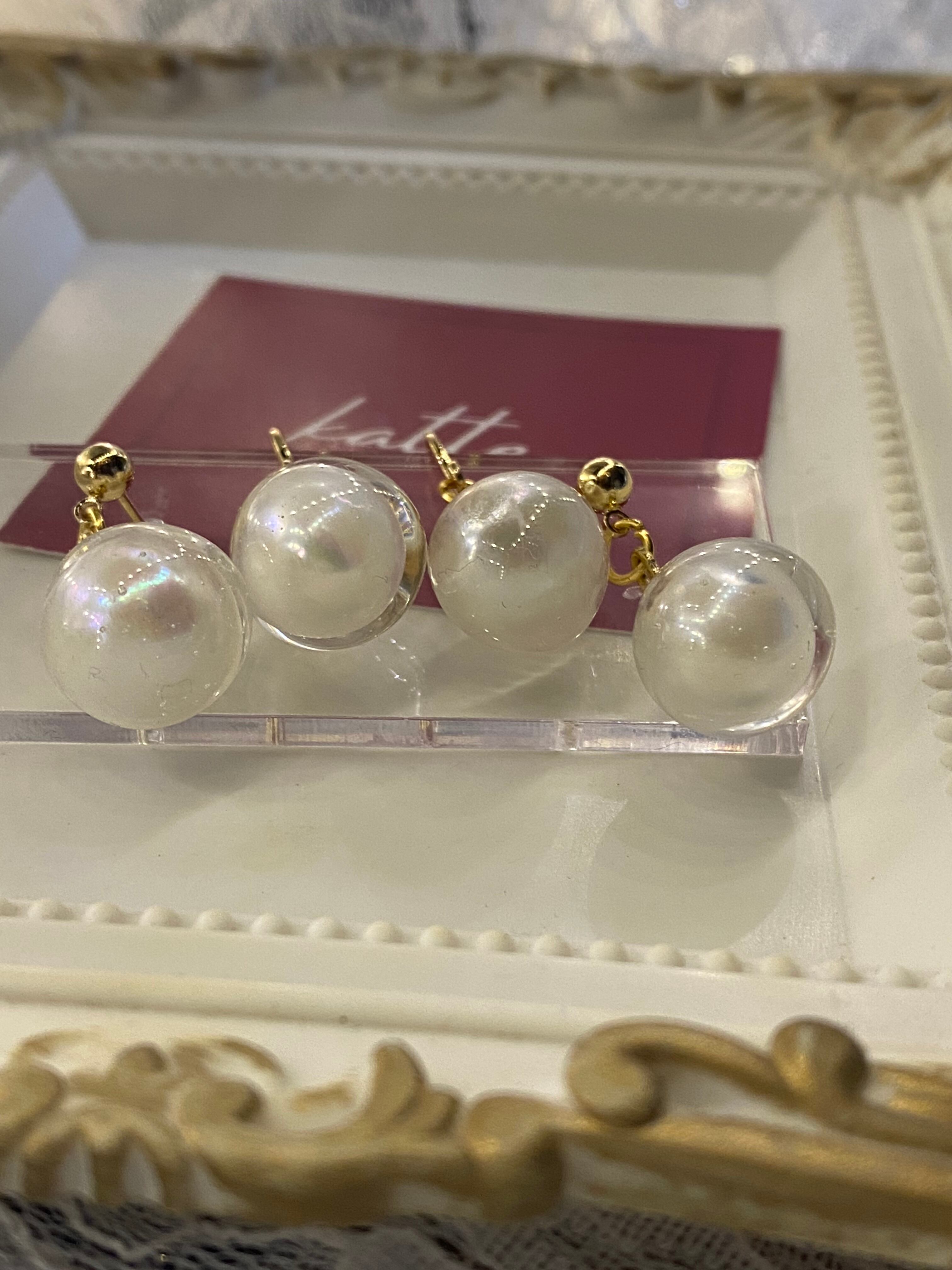 あこや真珠を贅沢に使用した、華やかなパールボールです。一つ一つ丁寧にレジン工程を繰り返してます。この美しさは、素材と技術によるもの。あこや真珠は輝きが強く、光沢感も豊かで、最高級品質を誇ります。そして、その美しさを一番に生かすように、一つ一つ丁寧にあこや真珠にレジンを絡ませボールにしました