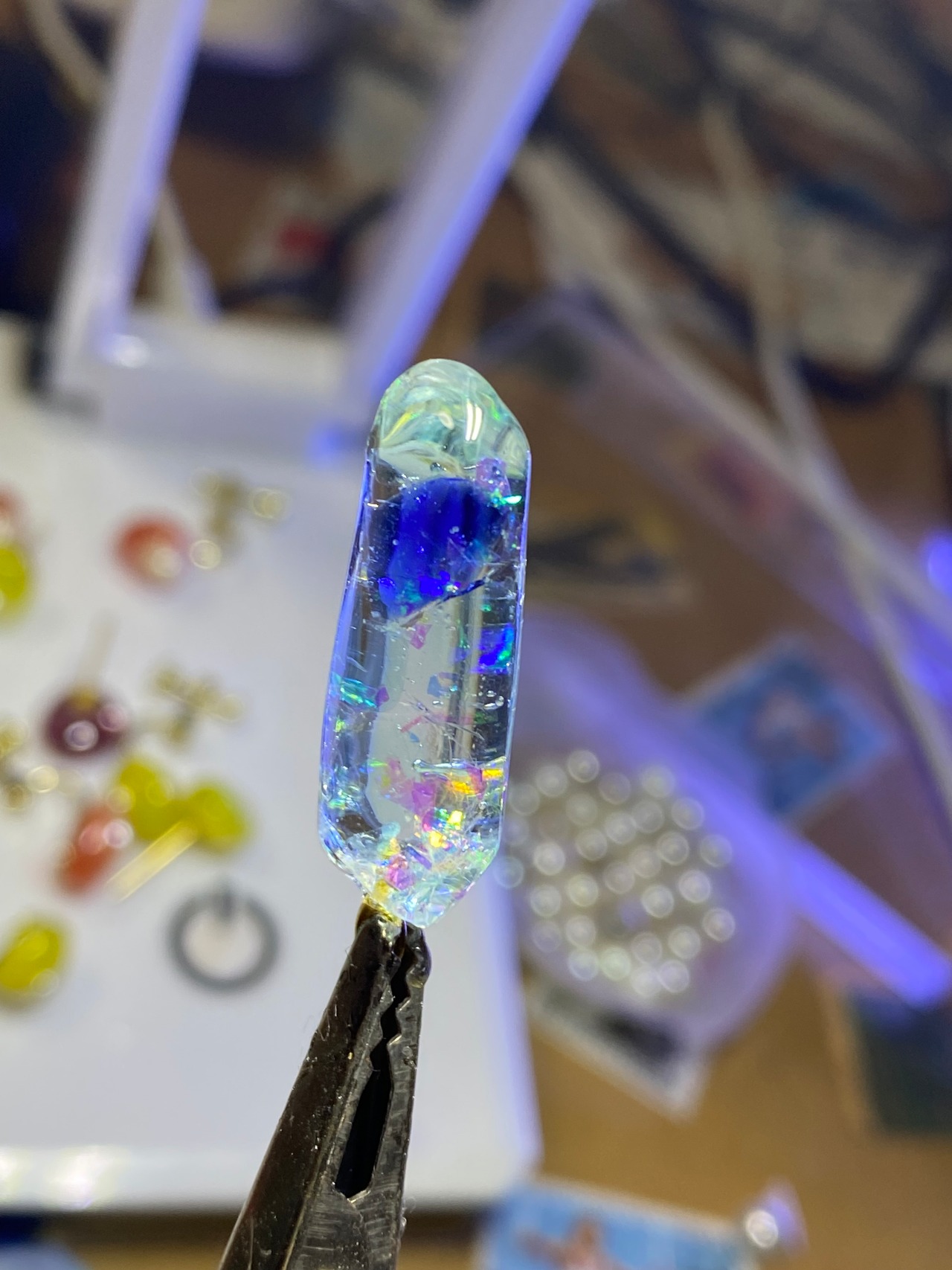 このアクセサリーには、一つひとつ丁寧に作り上げています。鉱石のモールドにれじんを流し込み、それを丹念に仕上げることで、独特な形状と美しい輝きを実現しています。ぜひ、その手作りのこだわりを感じてみてください。