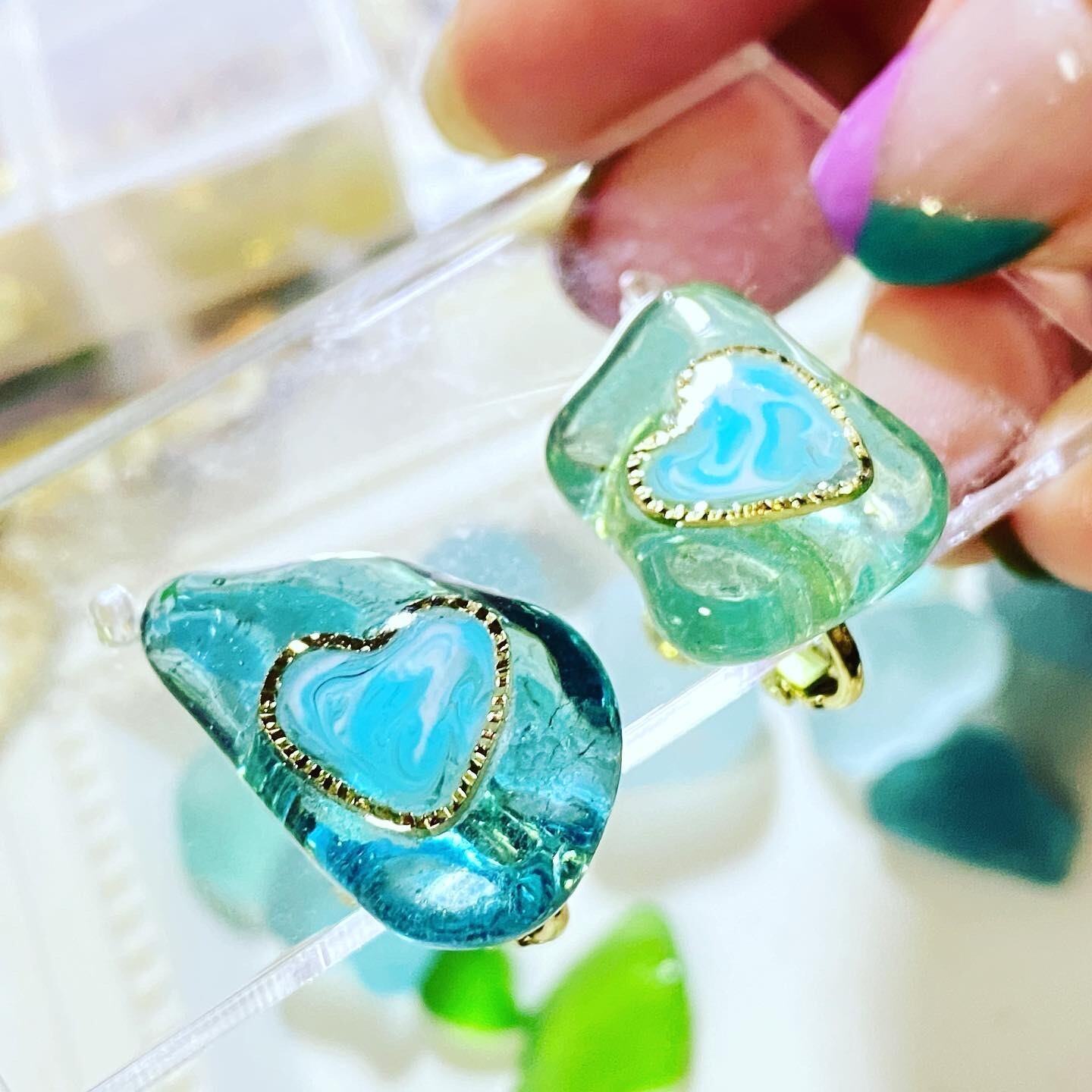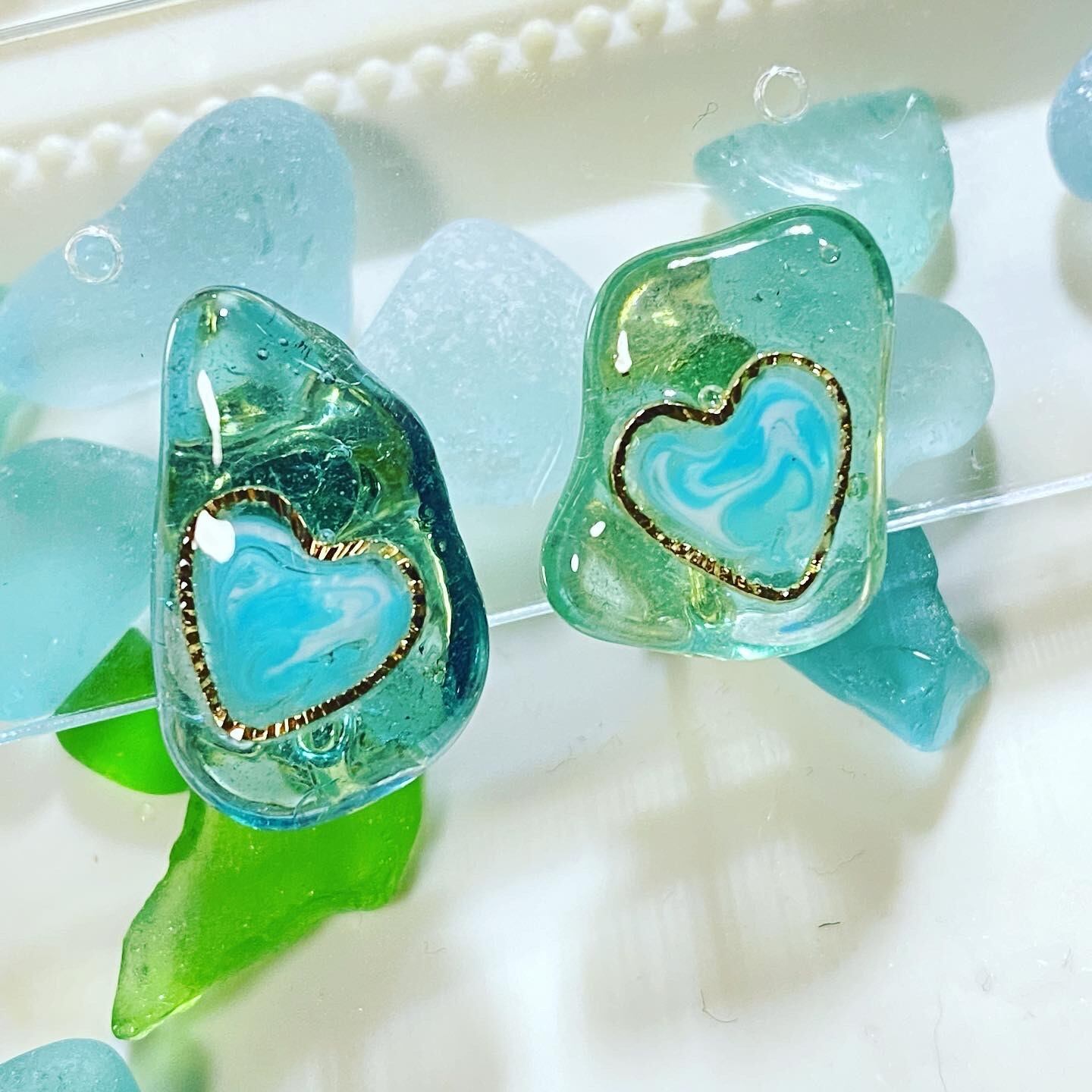 シーグラスに可愛いハート枠を貼り付けその中にマーブル模様を手書きで書います•*¨*•.¸¸♪