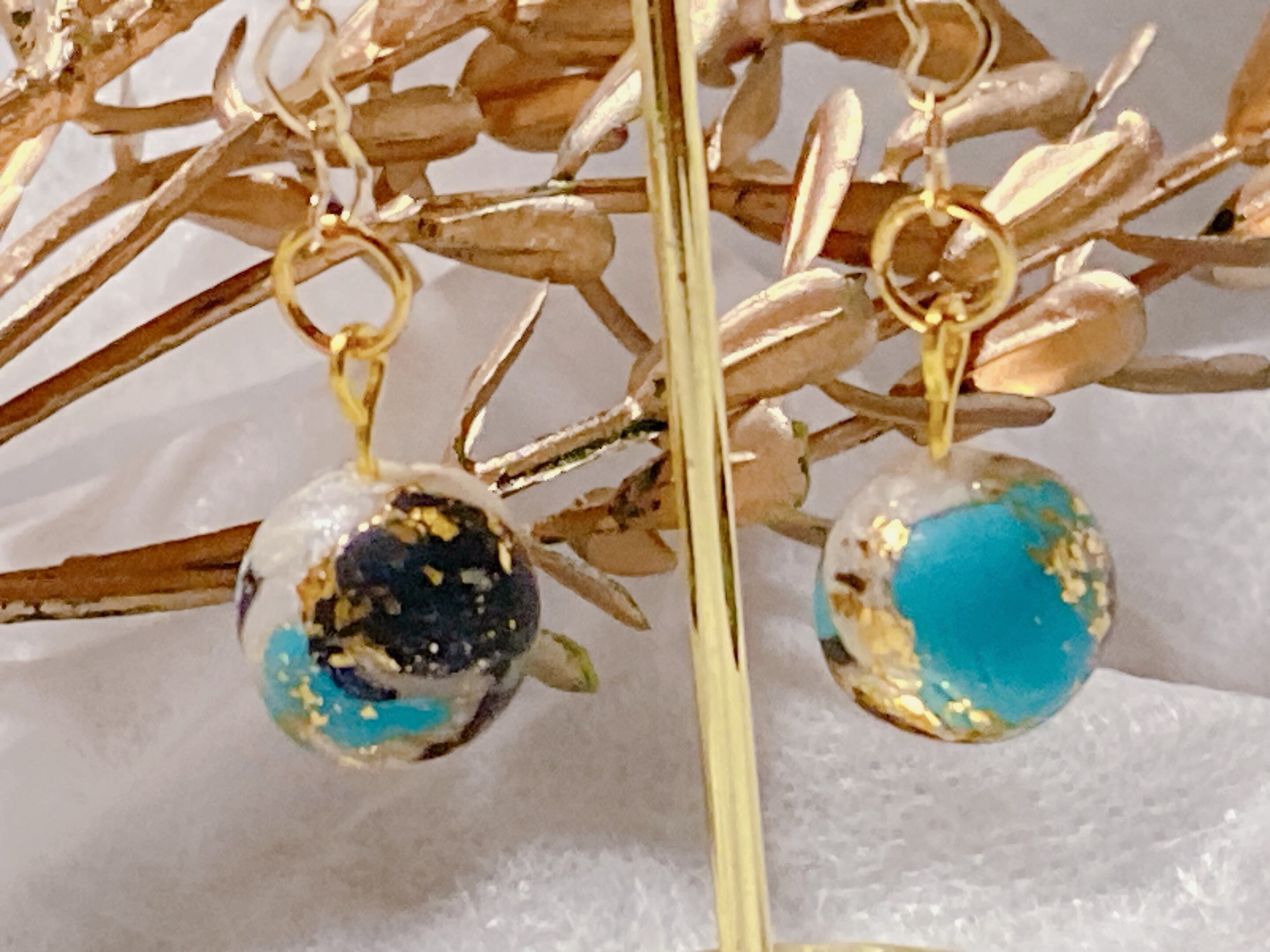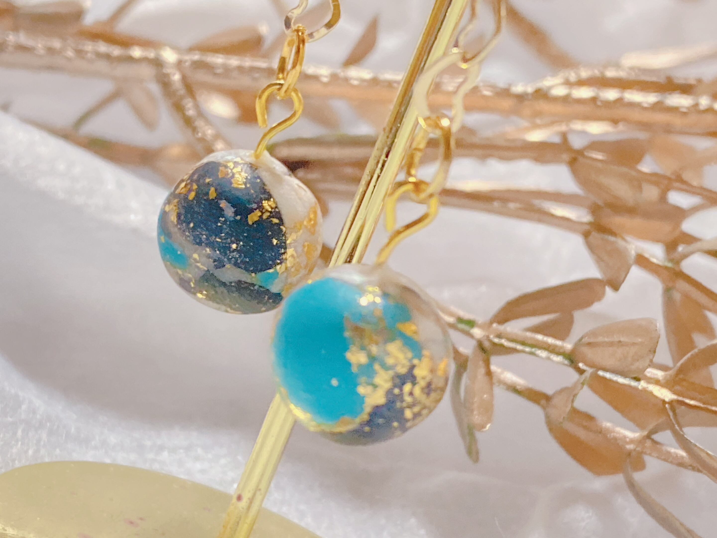 円形のポリマークレイ製のアクセサリー「round」です。軽やかな揺れ感が魅力で、シンプルなデザインがおしゃれなアクセントとなります。青、白、黒のカラーを混ぜて作ってます。