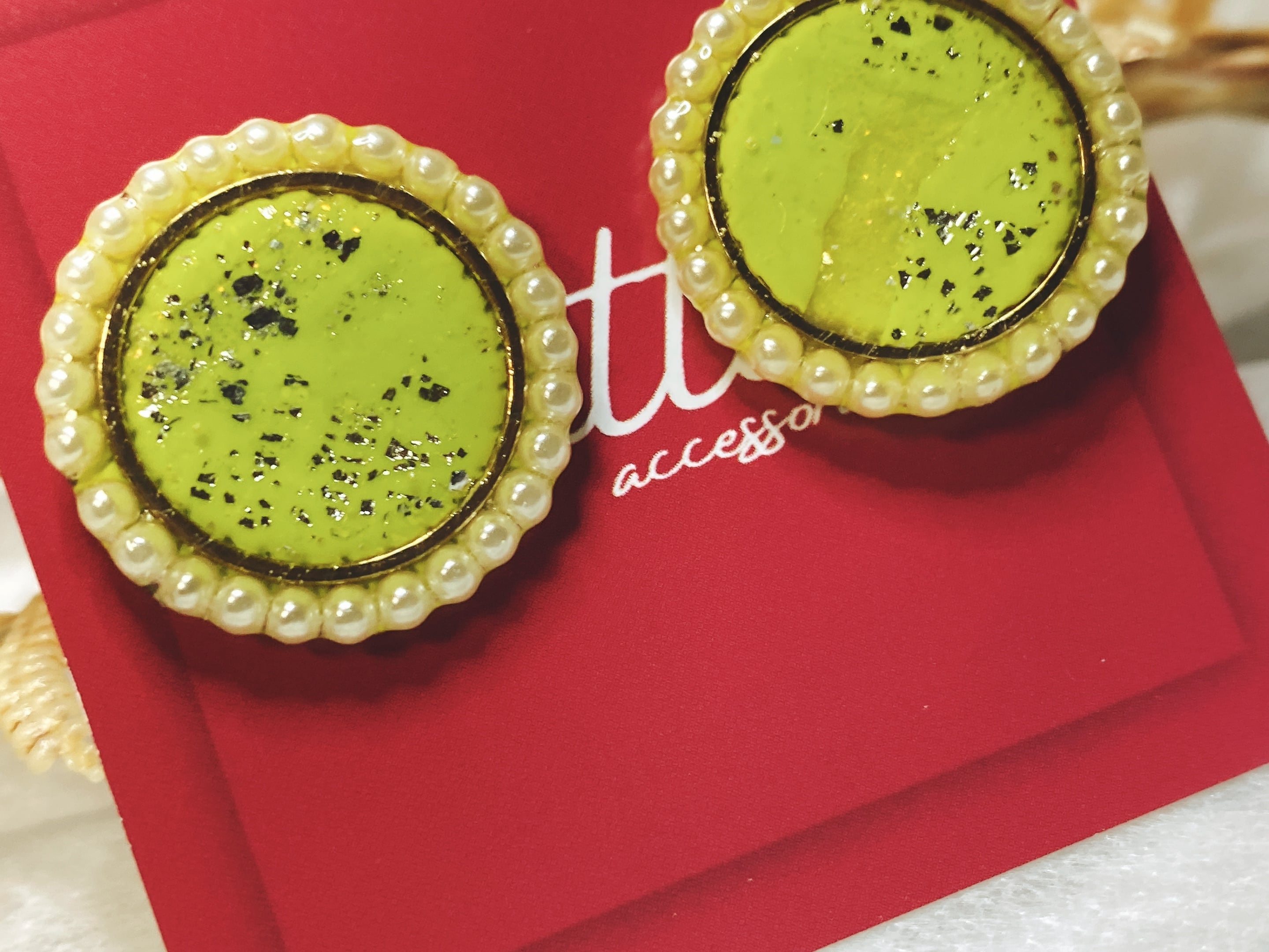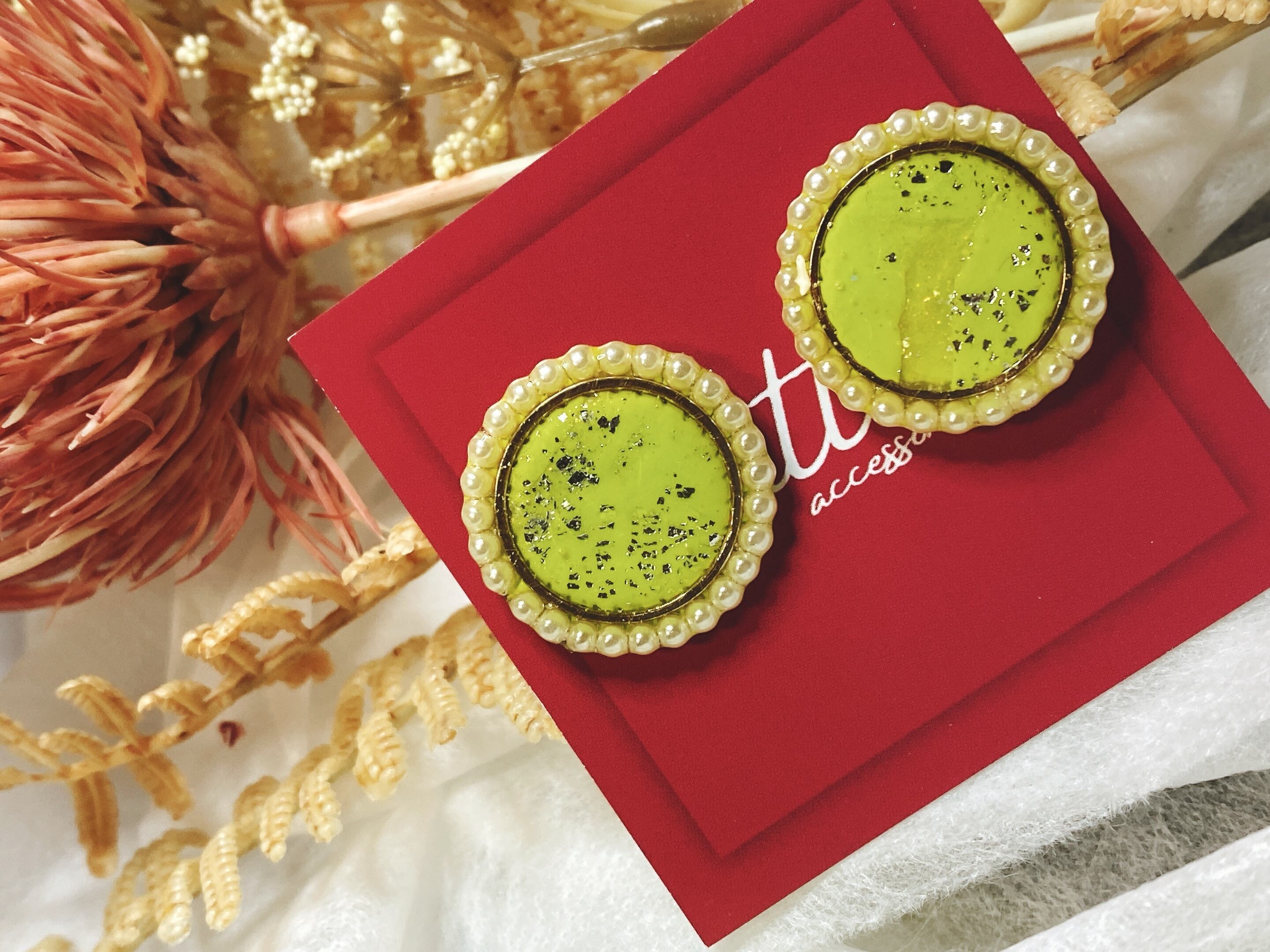 ラウンドシェイプの黄緑色のパールが美しい、Pearl round。ポリマークレイで作られており、軽くて丈夫なのが特徴です。さりげなく華やかさをプラスしたい時や、特別な日のアクセントとしてぴったりです。