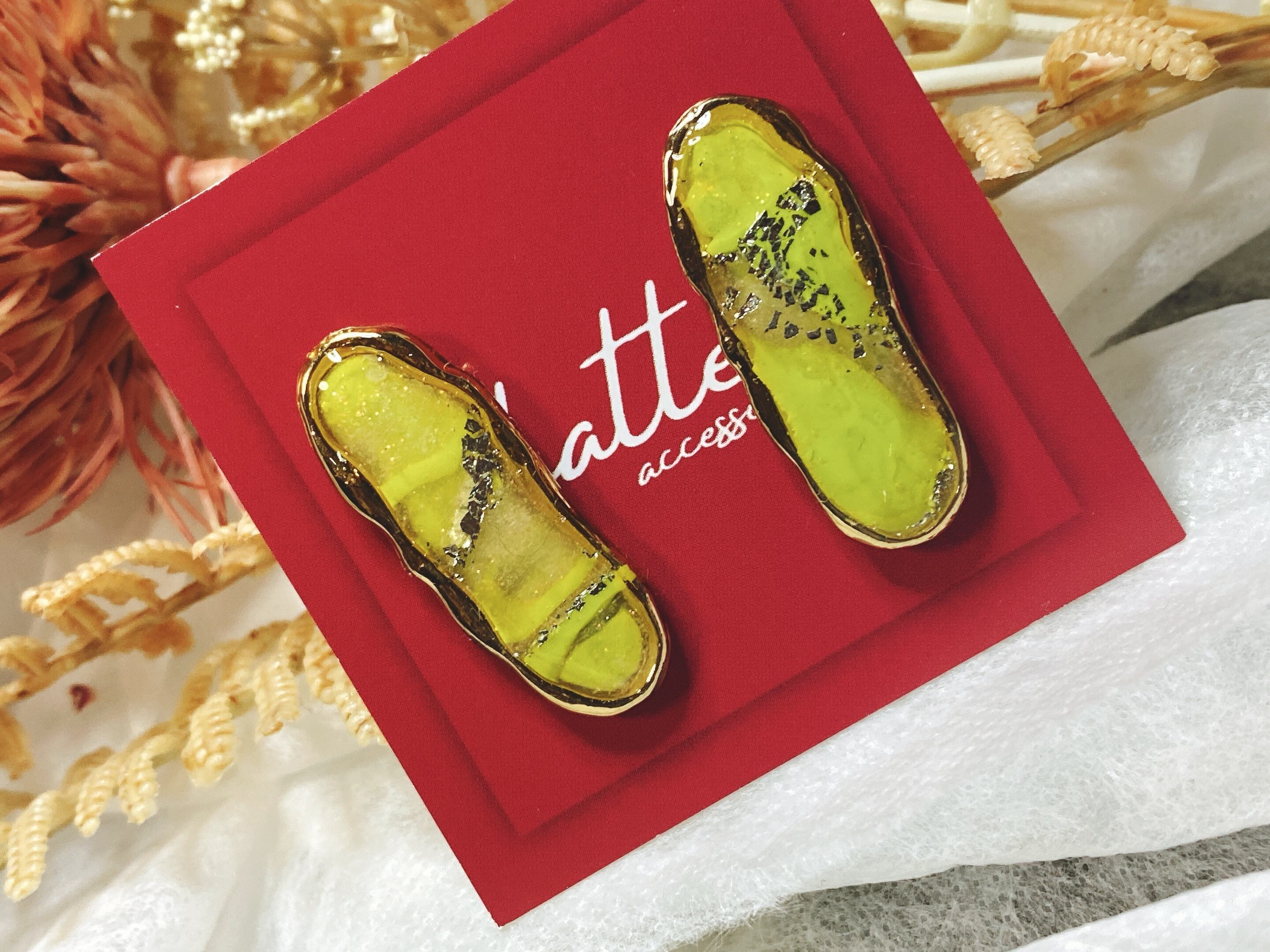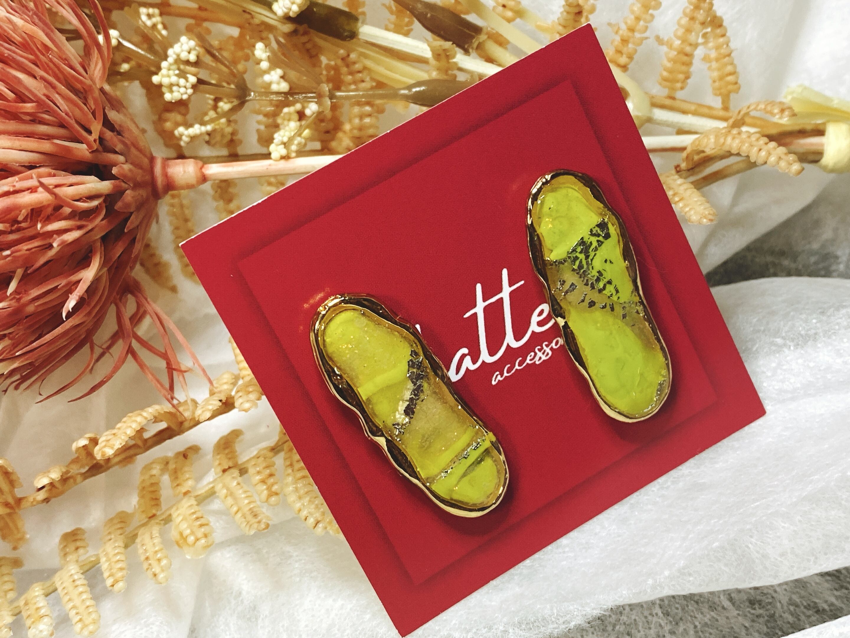 驚くべき美しさを追求したゴールドフレーム。ゴージャスなゴールドの枠に黄緑のポリマークレイで作られたピアスは軽量で丈夫。忙しい日常でも安心してお使いいただけます。一見シンプルなデザインですが、繊細なディテールがゴールドの輝きを際立たせています。