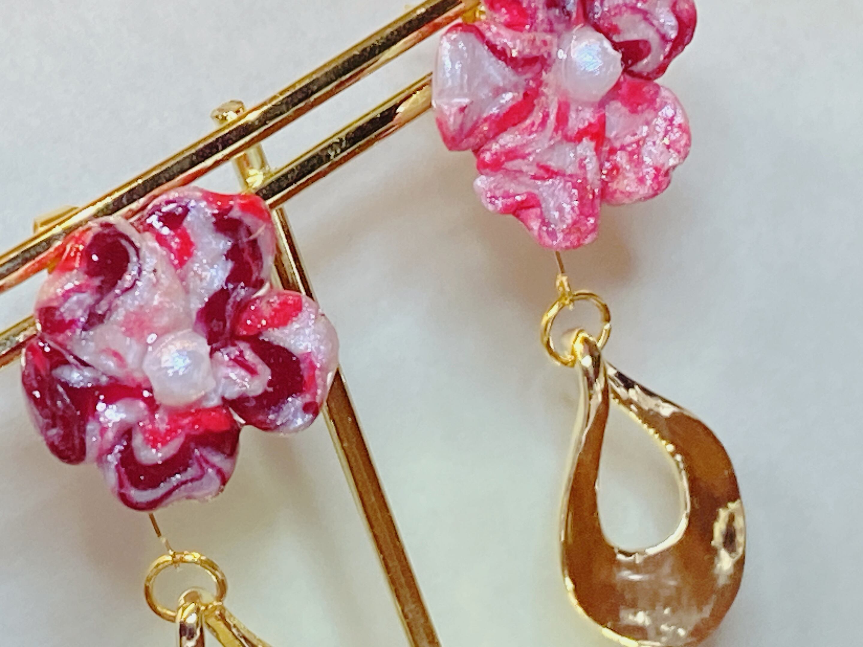 愛を込めて作られた「Love flower」。手ごねで花を制作。赤、白、紫のカラーをMIXして制作したオリジナルカラー。手に持つだけで心が温かくなり、幸せな気持ちに満たされそう。小さな存在ながらも、愛情を込めて丁寧に作られたポリマークレイのアクセサリーです。