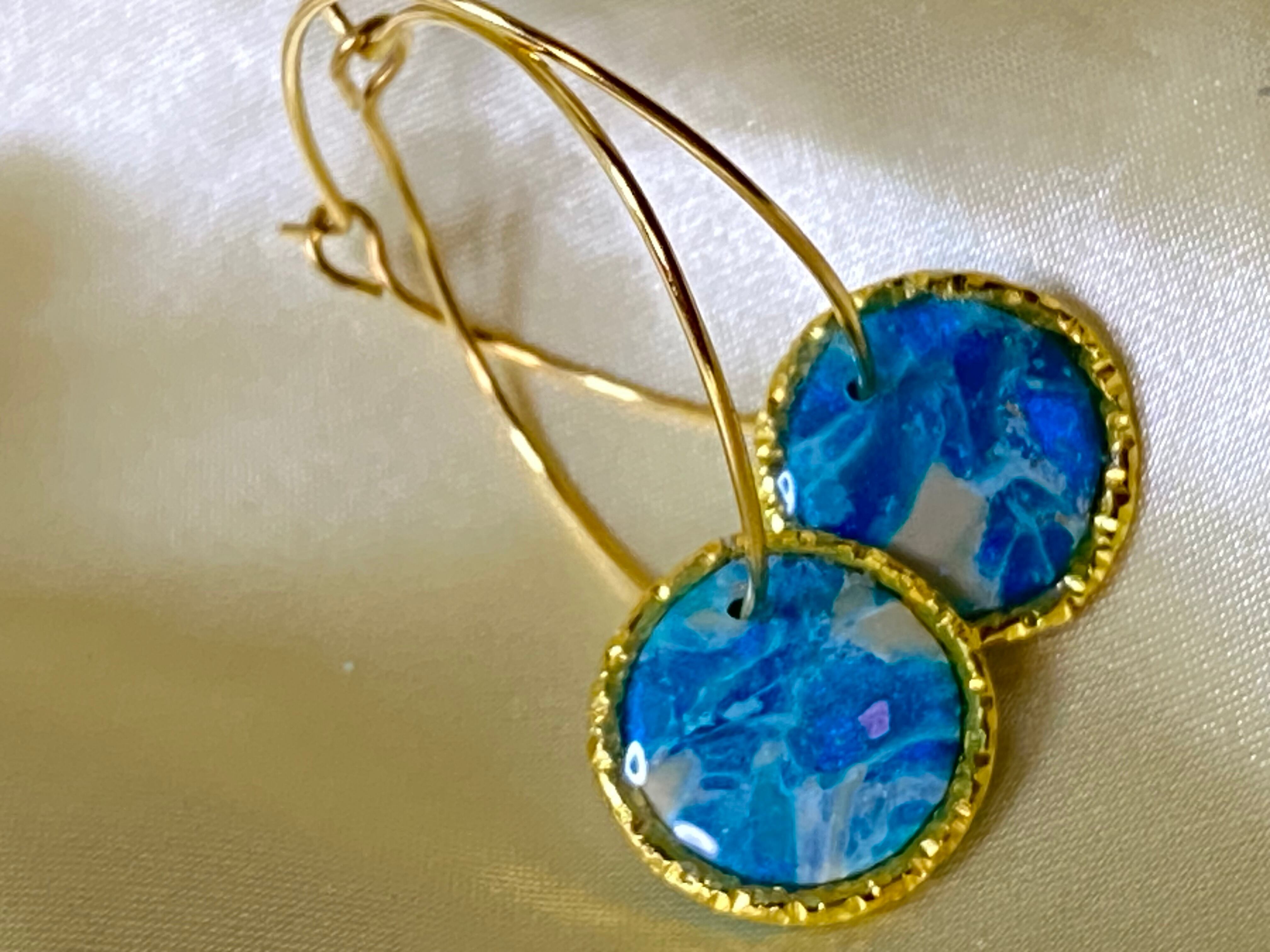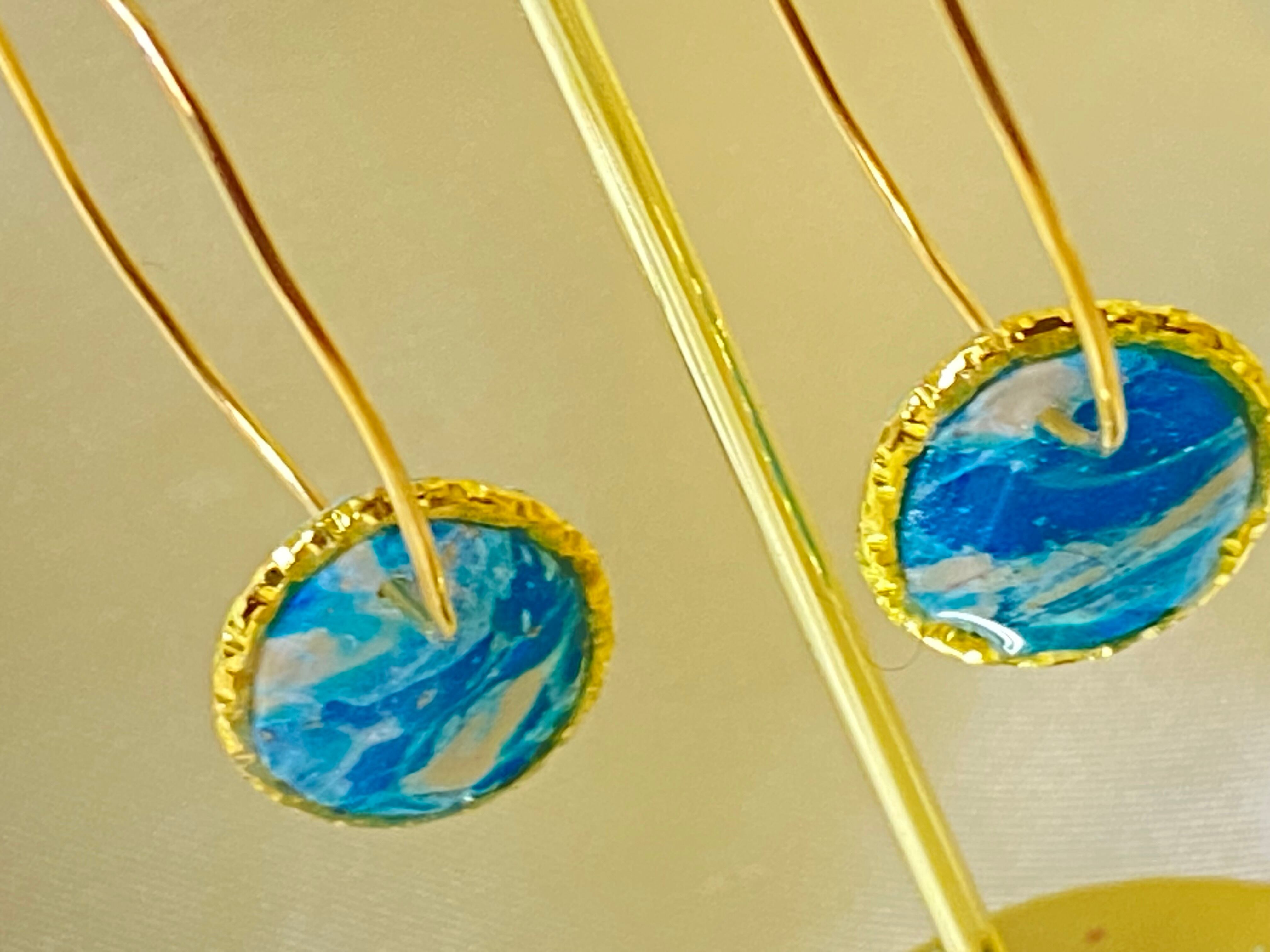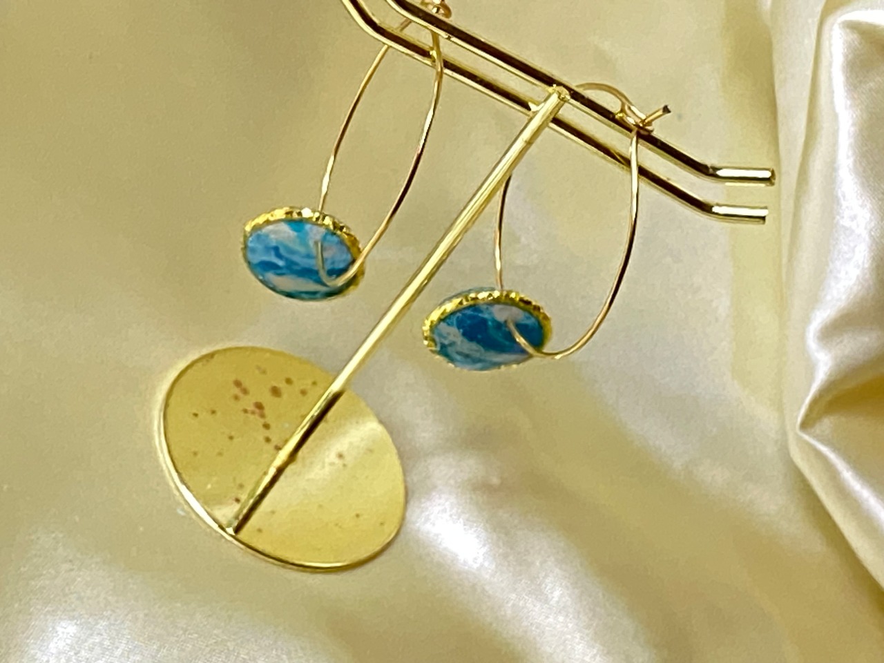 クレイアクセサリー~海月~は、ポリマークレイを使用した、海が月に転写したようなイメージの青色の丸いアクセサリーです。手作りのため、1つ1つの色合いや形状が微妙に異なり、他にはない個性的なアイテムです。