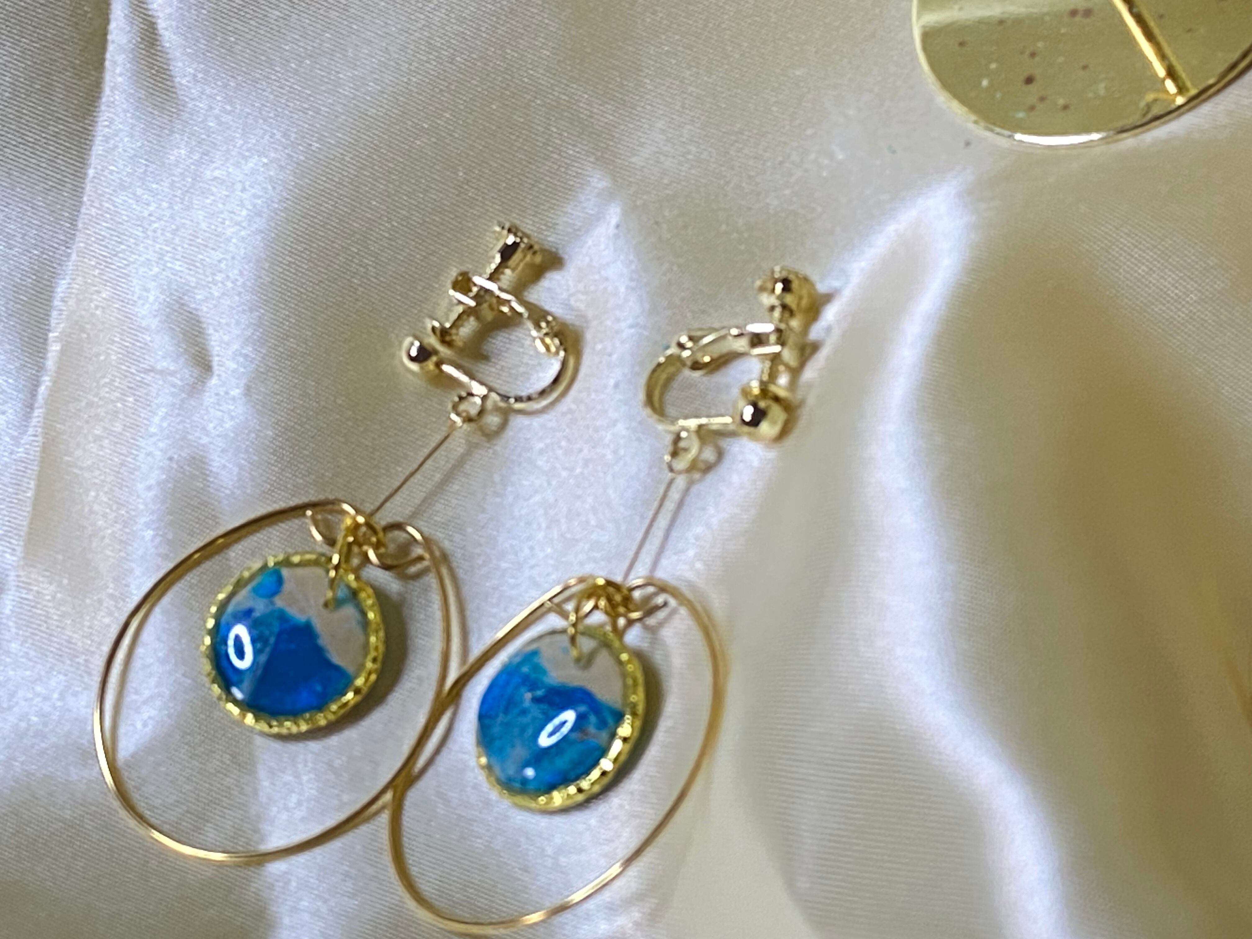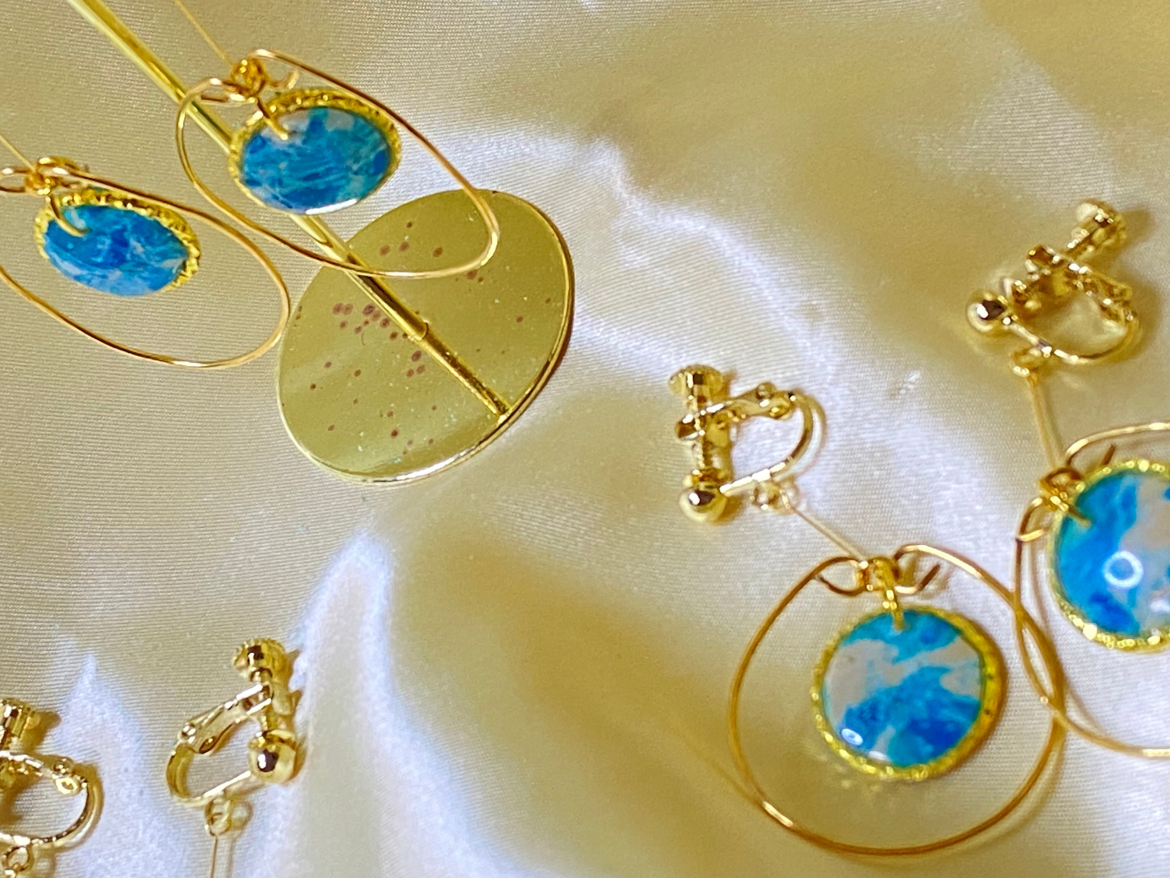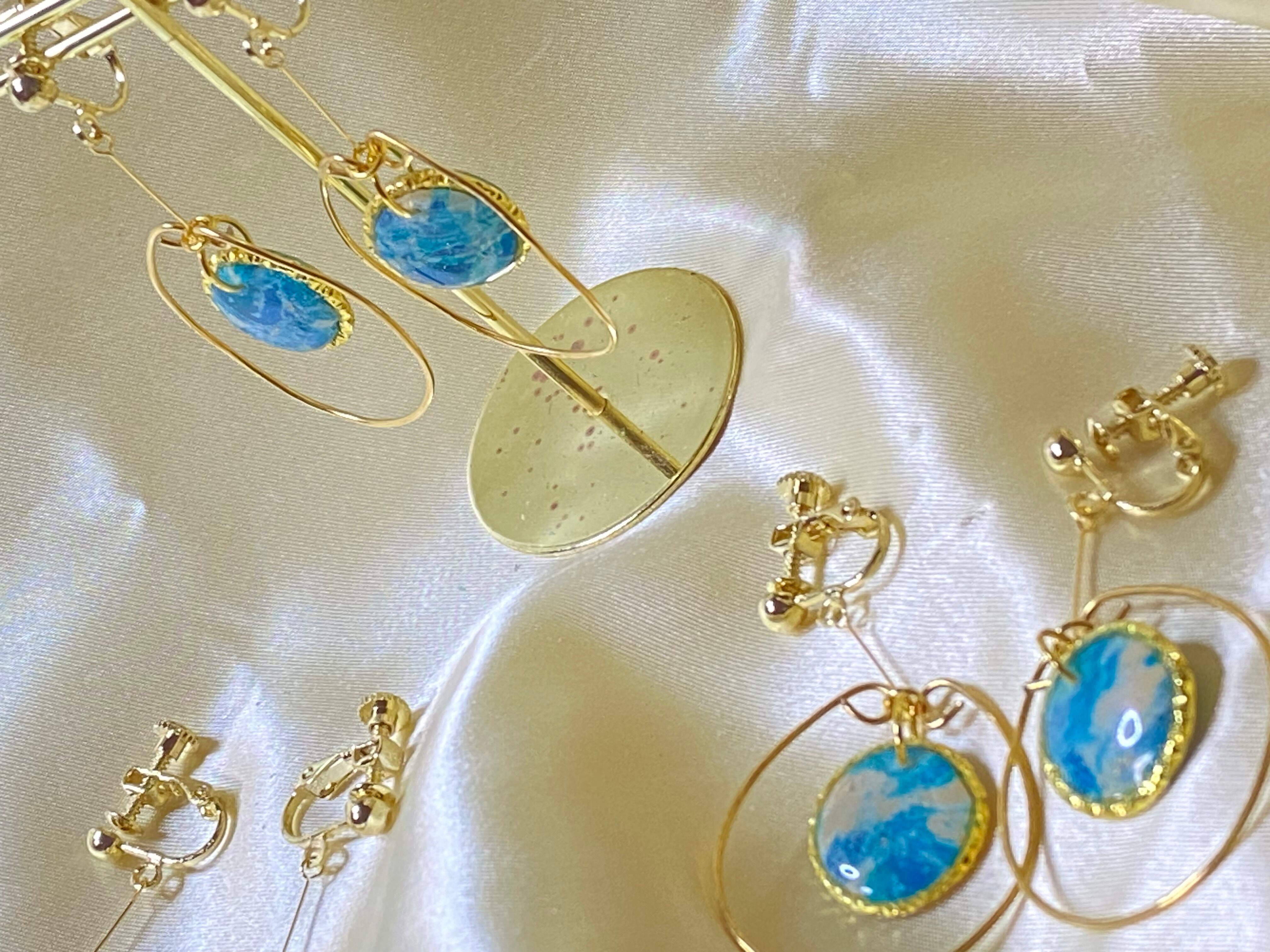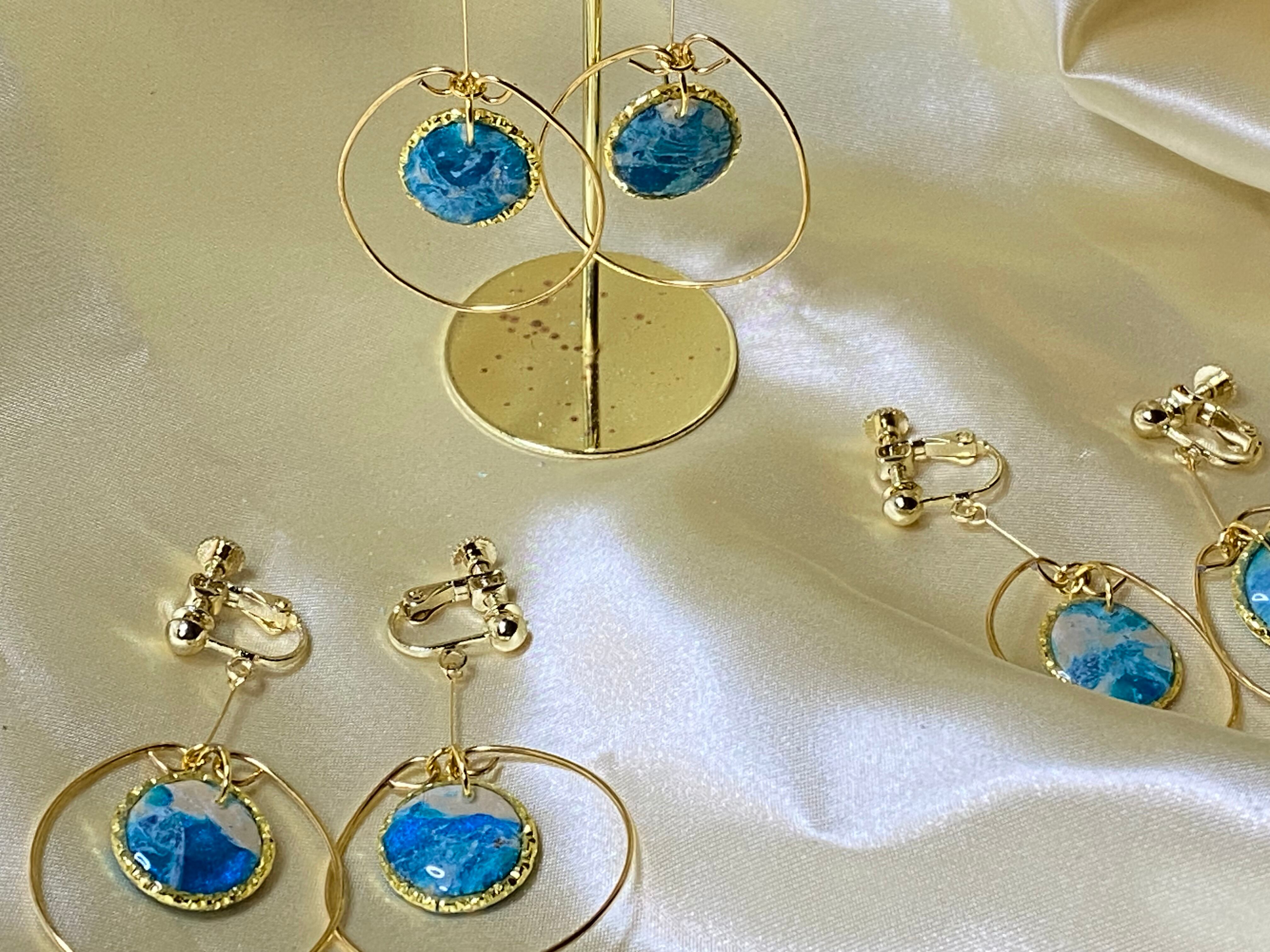 クレイアクセサリー~海月~は、ポリマークレイを使用した、海が月に転写したようなイメージの青色の丸いアクセサリーです。手作りのため、1つ1つの色合いや形状が微妙に異なり、他にはない個性的なアイテムです。