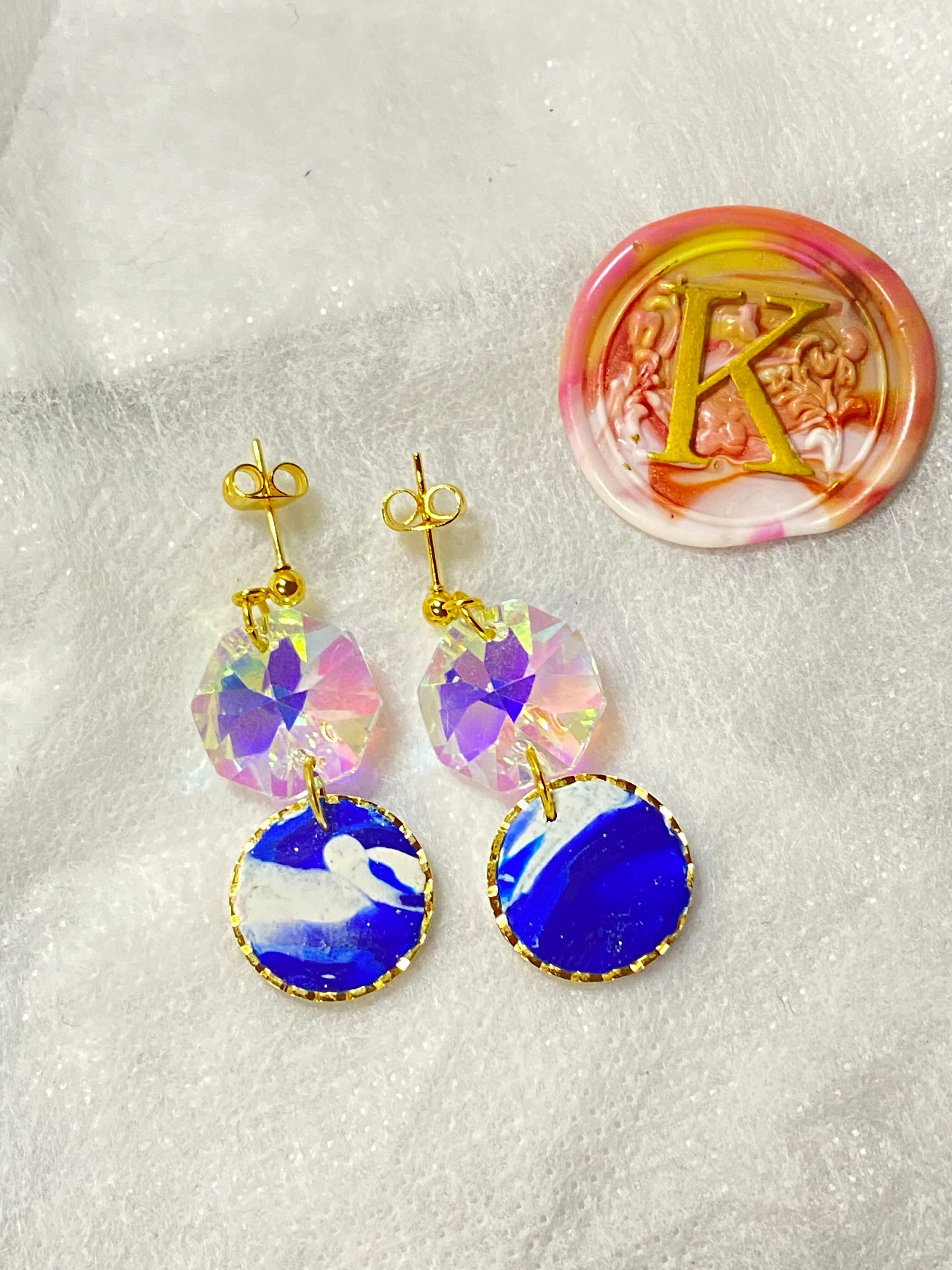 丸いフレームにポリマークレイで彩られた、青と白の輝く一点物です。さらに、クリスタルビーズが煌めくデザインで、おしゃれな装いを演出します。軽くて装着感抜群のアクセサリーで、普段のコーディネートに華を添えます。一点一点手作りで丁寧に製作していますので、他ではなかなか見つからないオリジナリティーがあります。 あなたの日常を彩る一瞬を、まるで宝石のように華やかに照らしてくれる「round」。自分へのご褒美や、大切な人へのプレゼントにも最適です。この特別な一点物に触れて、あなたも特別なひとときを過ごしてみませんか?長くお楽しみいただくために、丁寧な取り扱いをお願い致します。