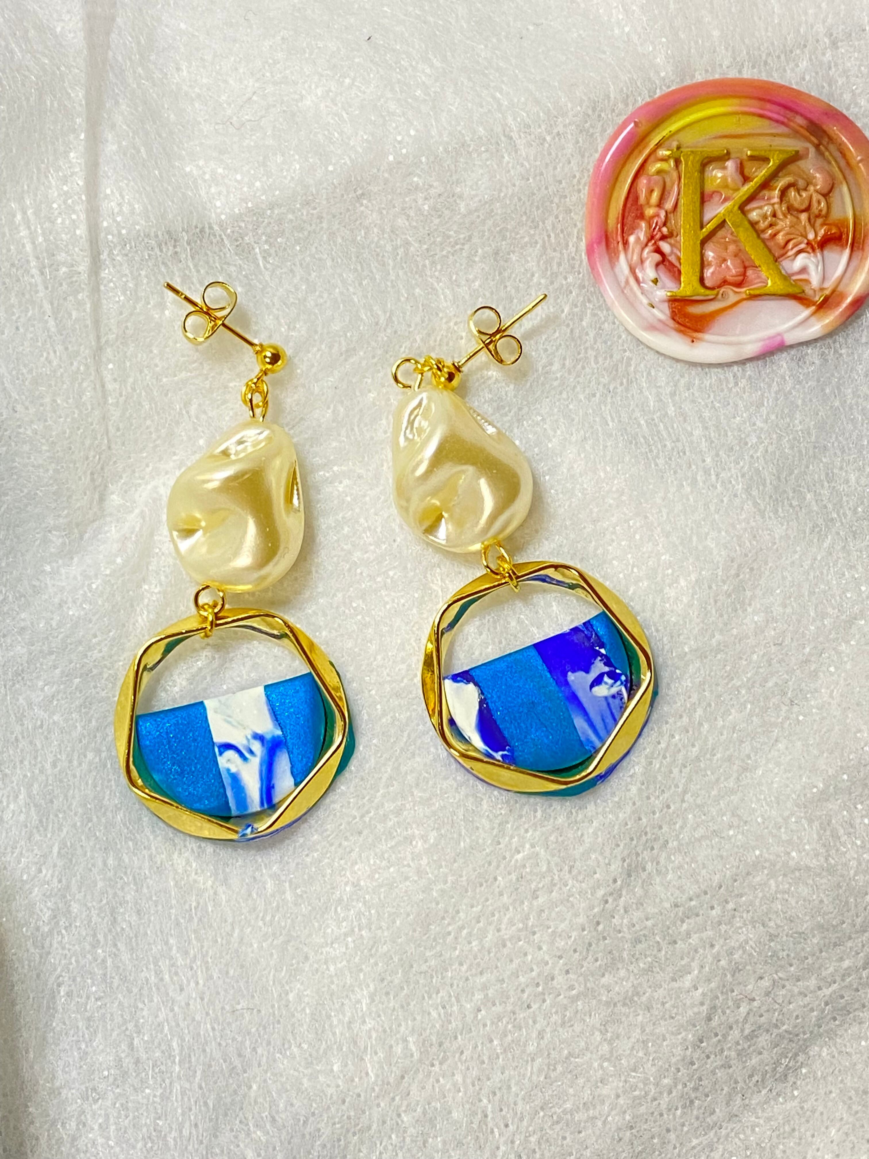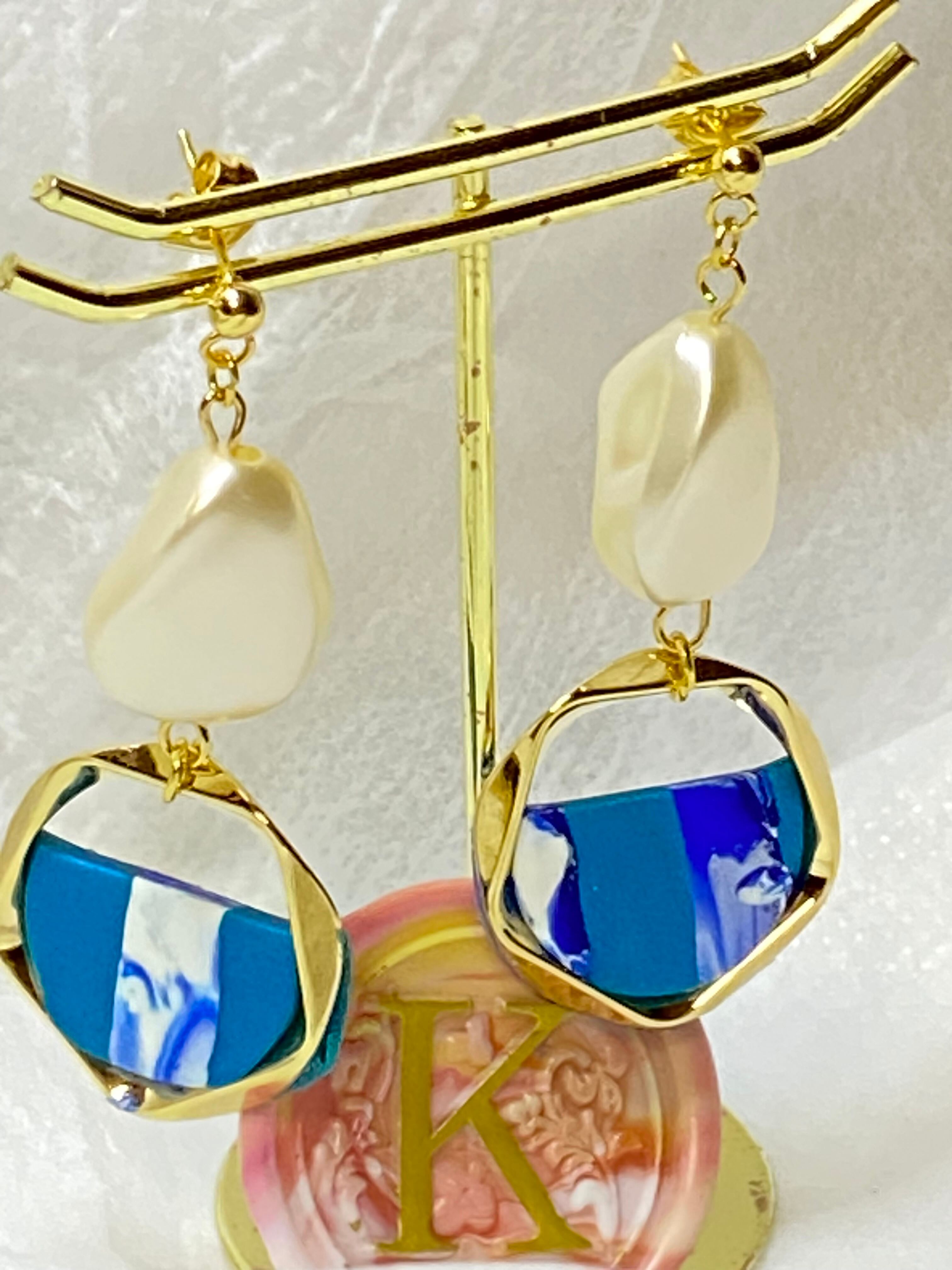 ユニークなヘキサゴンフレームが特徴の一点物アクセサリー、"hexagon"。ポリマークレイで手作りされた青と白のカラーリングに、ターコイズブルーのアクセントが施されています。さらに、変形パールが煌めくデザインで、どこか神秘的な雰囲気を演出します。