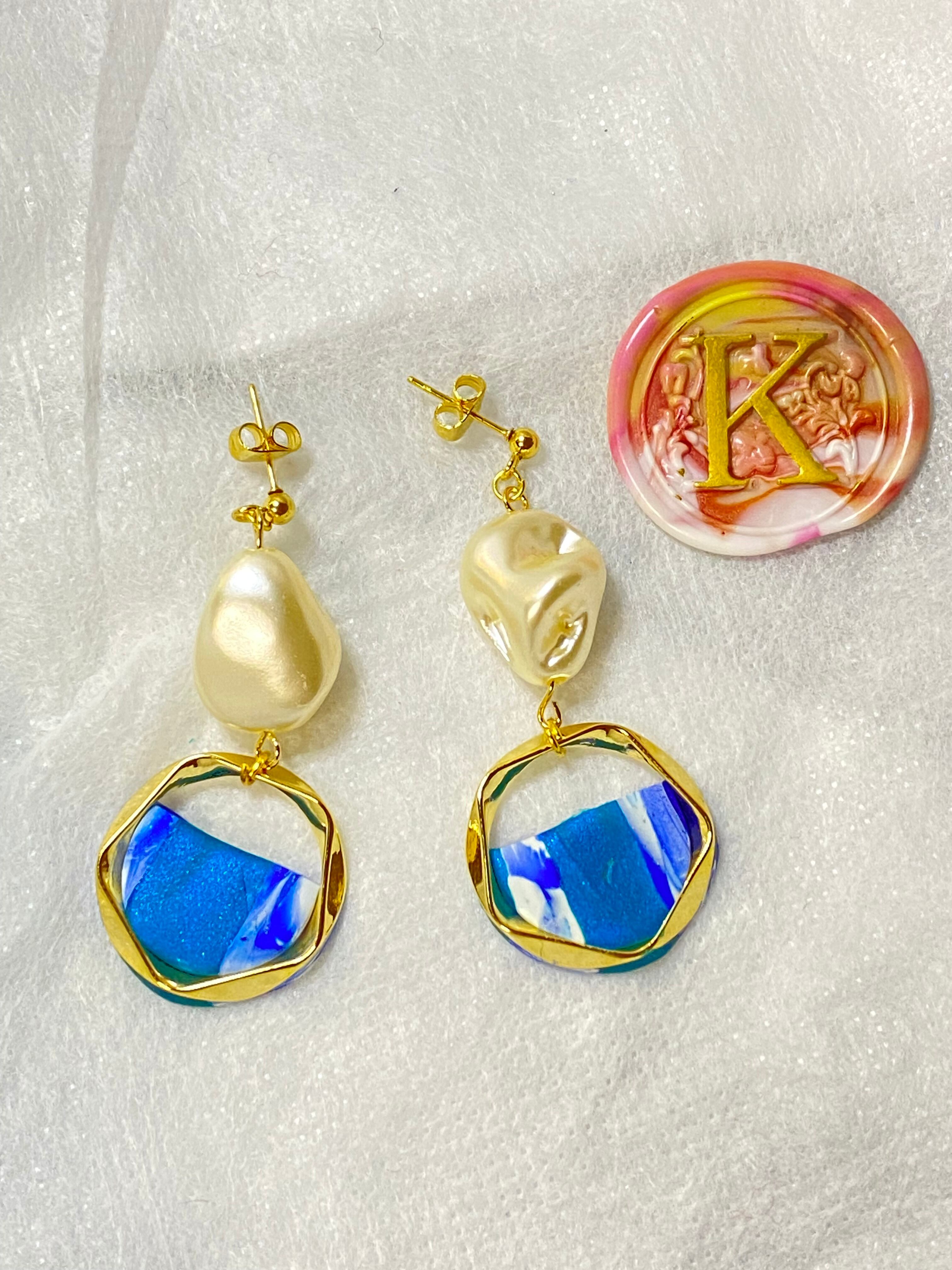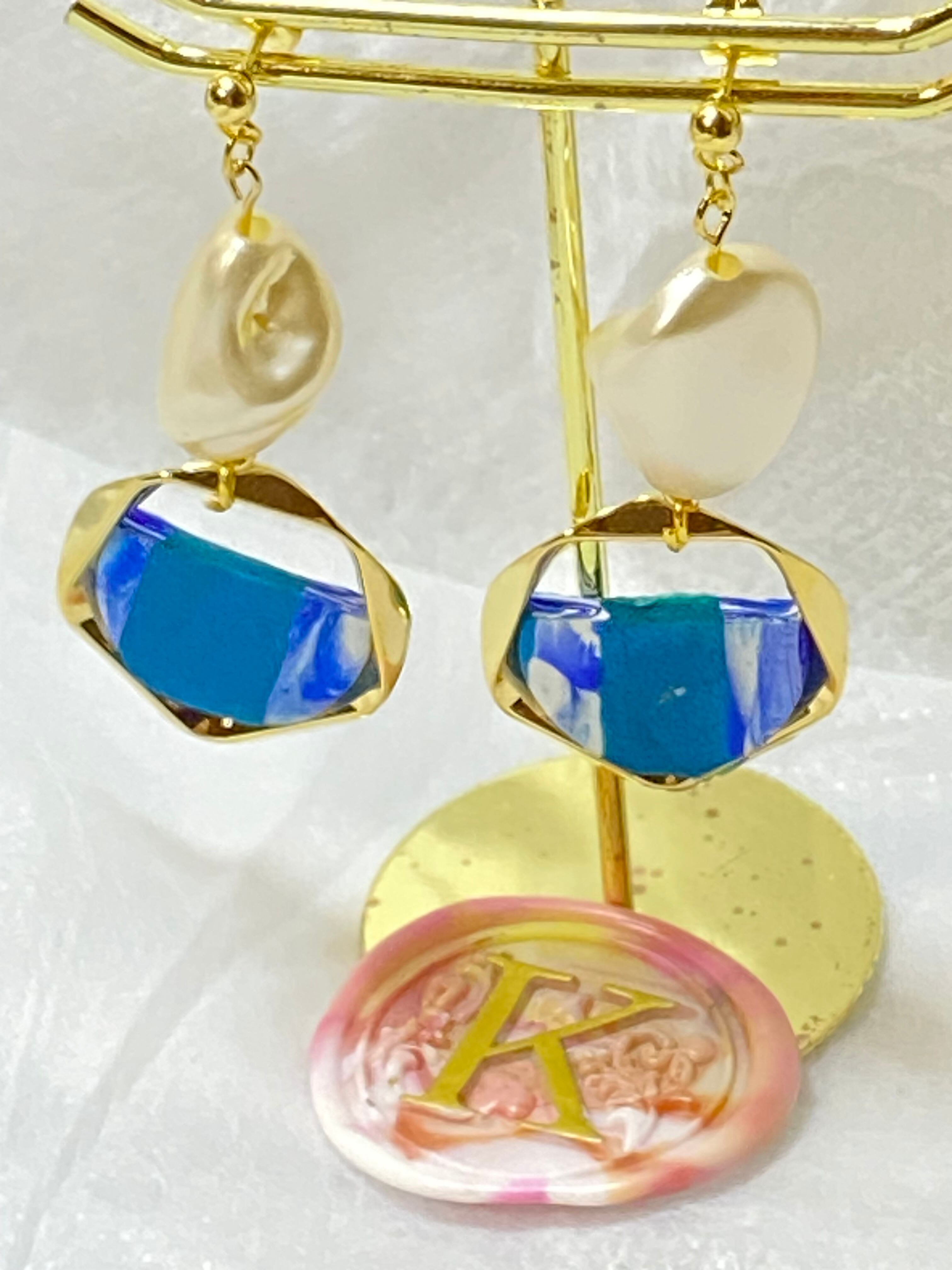 ユニークなヘキサゴンフレームが特徴の一点物アクセサリー、"hexagon"。ポリマークレイで手作りされた青と白のカラーリングに、ターコイズブルーのアクセントが施されています。さらに、変形パールが煌めくデザインで、どこか神秘的な雰囲気を演出します。